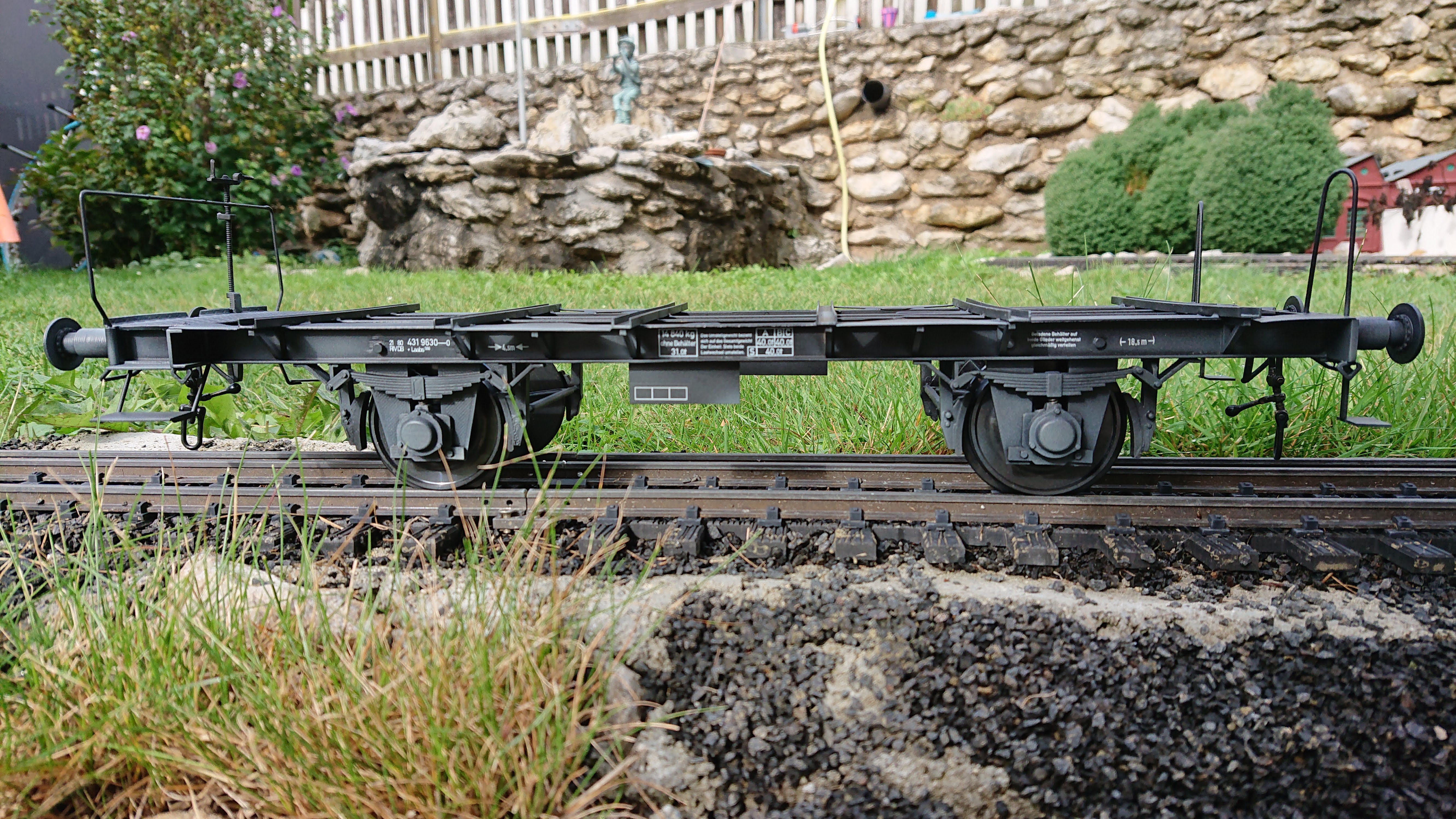 Контейнеровоз - Латунная конструкция, нормальная колея (64 мм), буксы и буфера подпружинены, функциональная винтовая стяжка, шарикоподшипники,шасси индивидуально адаптируется к вашим контейнерам.